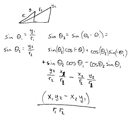 That identity is the only reason we end up multiplying xs and ys – because sines become ys and cosines become xs. The reason that the product of the magnitudes of the vectors shows up in the final cross product is that those are the lengths of the hypotenuses, and we don’t bother to divide them out.
