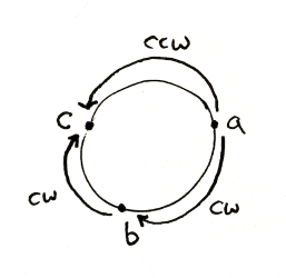 a < b, b < c, but c < a. That’s not gonna work out for us. Also: what happens when the sine is zero? We’re going to get inconsistent results when two points are co-linear with the origin, but lie on opposite sides of it.