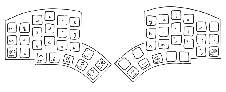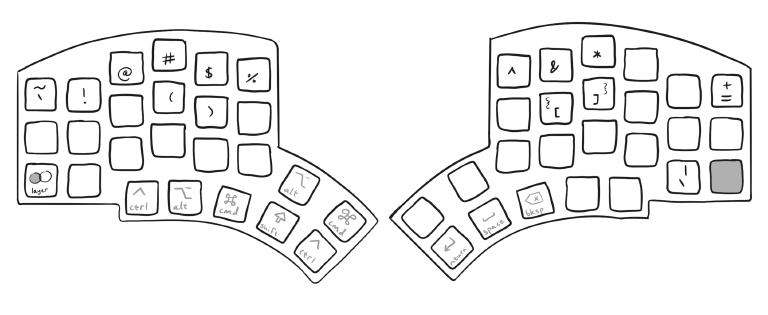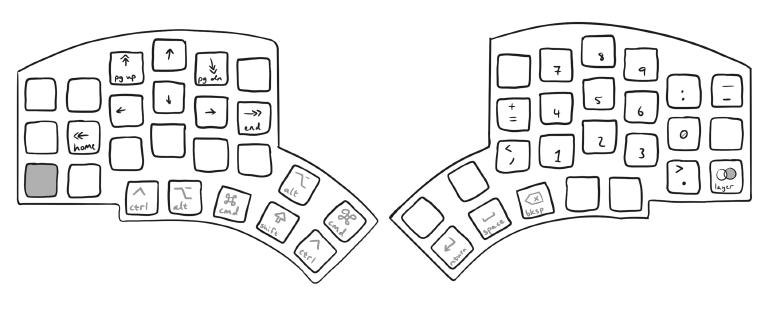 Note that every modifier key is on the left thumb: this matches how I type on my Macbook keyboard, with the exception that I will sometimes press control with the knuckle of my curled pinky finger.